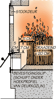 LET OP! Experimenten die we enkele jaren na het verschijnen van deze aflevering uitvoerden hebben geleerd, dat de richting van verbranding van de bundel hout in de standaard tegelkachel bepalend is voor de zeer hoge temperaturen en geringe rookvorming, die karakteristiek zijn voor de nieuwe manier van hout stoken. Het aanmaakvuurtje moet niet vlak achter de stookdeur branden, maar tegen de achterwand van de standaard tegelkachel. Zodra het is aangestoken moet de volledige bundel stookhout tot tegen dit vuurtje worden gebracht, zodat de luchtstroom van de geopende luchtklep onder de stookdeur de houtbundel koelt tot waar de verbranding plaatsvindt. Hiermee wordt bereikt dat houtgas pas op de plaats van verbranding kan ontwijken. De kachel brandt daardoor veel rustiger en aanzienlijk heter en zuiniger.