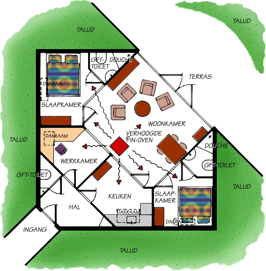 Als centrale warmtebron en leverancier van een gezellige zitplek dient een Fin-oven (of vergelijkbare tegelkachel), maar dan extra verhoogd* om ook warmtestraling te leveren via hoger geplaatste tussenramen in binnenmuren aan belendende vertrekken. De aldus ‘doorgestraalde’ warmte komt in zo’n aangrenzend vertrek alleen tot zijn recht als zich in het stralingsveld een enigszins schuin geplaatste, inwendig van reflectiefolie voorziene wand bevindt.