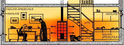 Het andere huis wordt warm door straling ofwel infraroodwarmte. Op de tekening gebeurt dat door een tegelkachel, maar er is ook een andere manier: door middel van met cv-water verwarmde muren** (en/of gedeeltelijk: verwarmde vloeren). De warmte komt uit warme stenen oppervlakken: tegels of stucwerkmuren en wordt weerkaatst door spiegelende oppervlakken (gemetalliseerd folie of aluminiumfolie op bouwpapier) achter een houten wand of stuclaag en onder een houten of tegelvloer. De lucht wordt praktisch niet verwarmd en blijft fris en koel; er is hoegenaamd geen stofcirculatie en via een altijd geopend bovenraam is er de noodzakelijke ventilatie van het huis. Dat betekent een gezond binnenklimaat en ook nog een aanzienlijk lagere stookrekening.