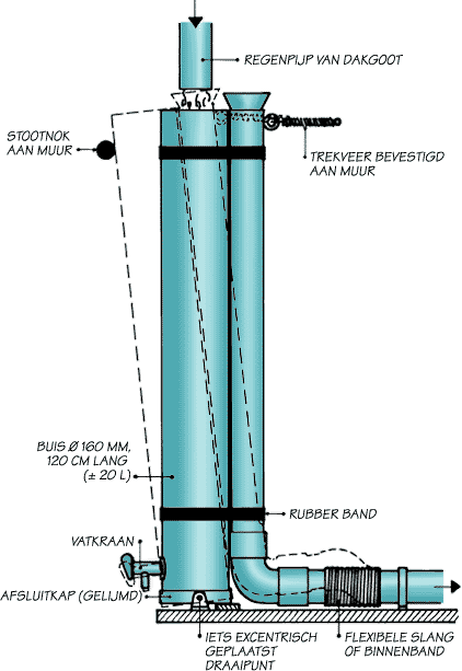 We gaan dit keer uit van in de vakhandel verkrijgbaar materiaal: een stuk pvc-buis van een flinke diameter, bijvoorbeeld 125, 160 of 200 mm, met daar aan vastgemaakt een stuk regenpijp (meestal 80 of 100 mm). De dikke buis krijgt aan de onderkant een vast te lijmen afsluitkap en vlak hierboven monteren we een aftapkraan (bijv. plastic vatkraan), die dient om na een eerste regenbui het opgevangen eerste water later te laten weglopen. De buis krijgt een draaipunt vlak bij de bodem, door alleen in de afsluitkaprand twee ondiepe, iets excentrisch geplaatste, gaten te boren, waarin twee instelbare bouten van 8 - 10 mm passen, die de buis via twee steunen kunnen dragen. Zorg voor een aan de huismuur of net onder de dikke buis bevestigde nok of een stukje ketting om de buis de juiste speelruimte voor het kantelen te geven.