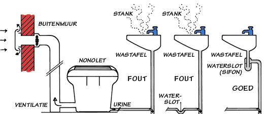 Gaat de urine-afvoer via een bestaande afvoerbuis van een wastafel, een douchebak of een ligbad, dan moet zich altijd een waterslot boven het afvoerpunt bevinden. Ontbreekt dit, dan... precies. Maar een ‘waterslot’ aanbrengen in de urine-afvoerbuis heeft geen zin, want daarin verzamelt zich de urine en dus... Toch heeft ook deze denk- en installatiefout voor de onnodige aftocht van menig Nonolet gezorgd!