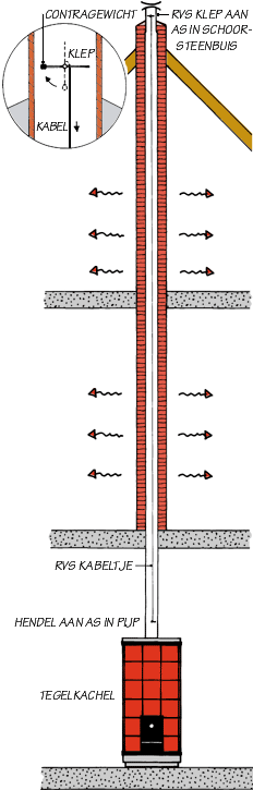 warmtestralingsverspreiding op een bovenliggende etage bijvoorbeeld in een slaapkamer of badkamer, waar de schoorsteen passeert. In de schoorsteen moet dan een klep komen die de pijp voor 90 procent afsluit en die bediend kan worden door een rvs-kabeltje, dat door de schoorsteen naar beneden tot vlak boven de kachel loopt en van daar uit kan worden bediend. De klep krijgt een contragewicht, waardoor hij openvalt zodra het kabeltje wordt losgelaten. Met een gemetselde schoorsteen op deze wijze benut is de kou goed uit een slaap- of badkamer te houden!
