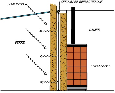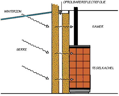 Door een vraag van een bezoeker aan ons websiteforum over een leemwand tussen serre en woonkamer ontstond het idee over een dubbele leemwand met spouw, met daarin een in- en uitrolbaar reflectiescherm.